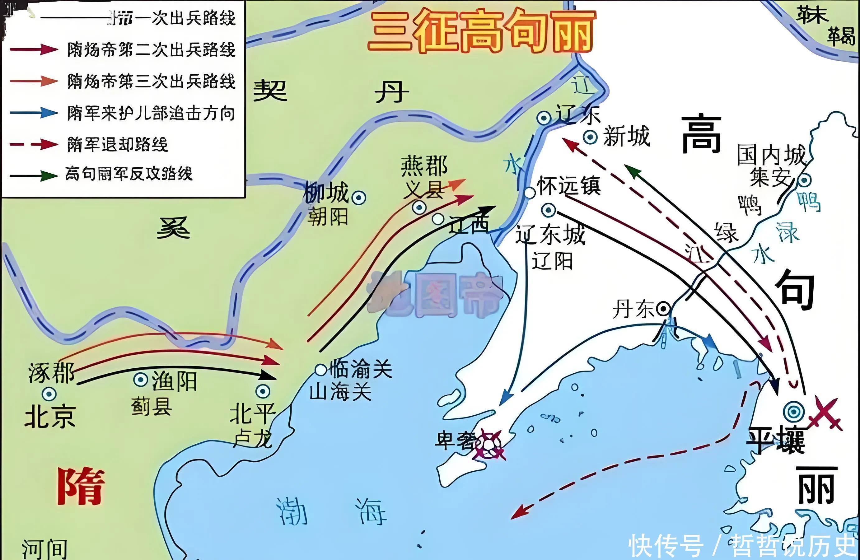 公元 614 年,杨广第三次征高句丽。由于国内面孔变生不测,士兵们士气低垂,无心作战。高句丽也因频年构兵,国力窘迫,于是向隋朝乞降。杨广见无法取胜,唯有凯旋回朝。